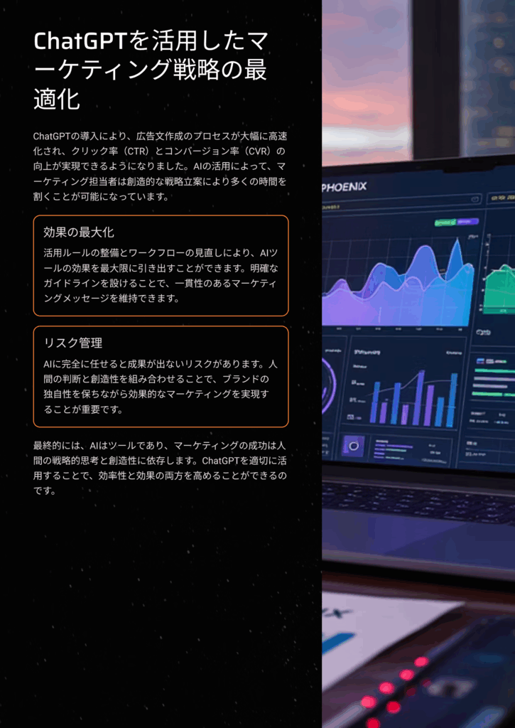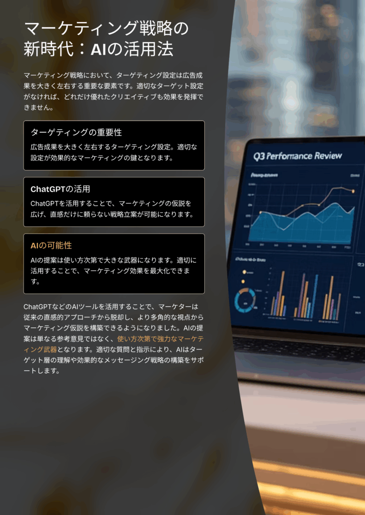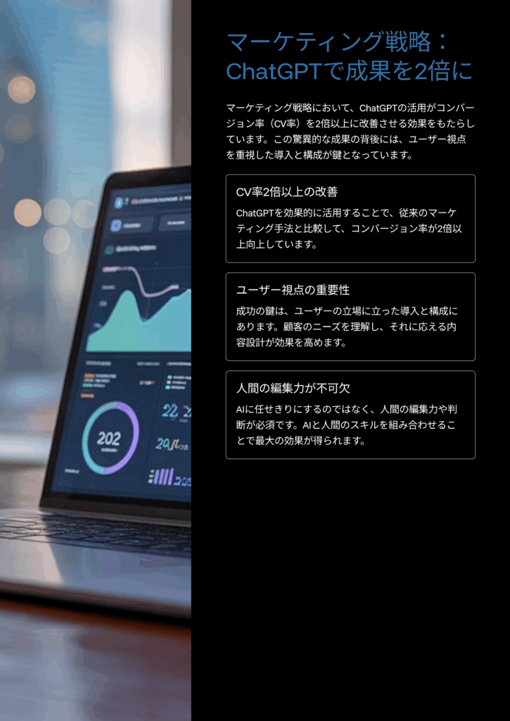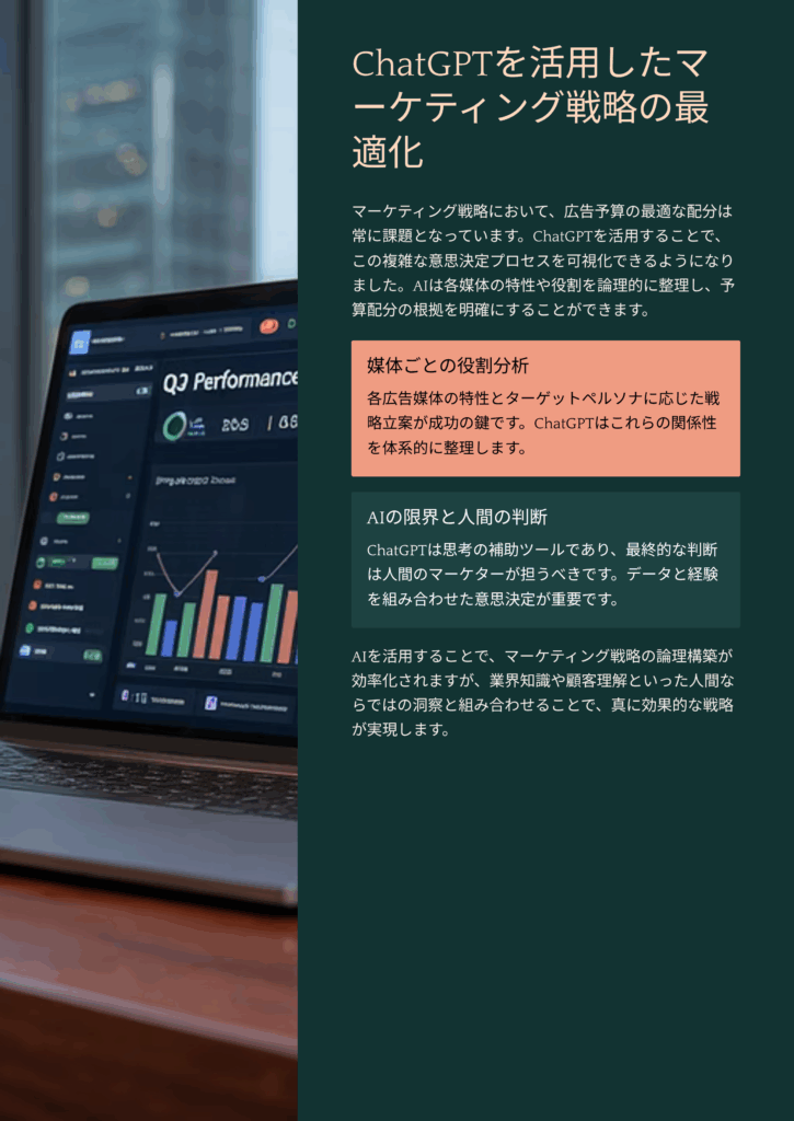ChatGPTで作成した広告文が、なぜクライアントに刺さり、高く評価されたのか?AI活用の工夫と本質を事例とともに解説します。目次を見て必要なところから読んでみてください。 ChatGPTで作成した広告文が評価された背景 ある若手のマーケターが、深いため... -