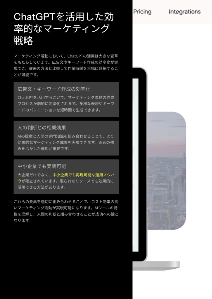 リスティング広告の成果が頭打ち…そんな悩みを抱える中小企業が、ChatGPTで運用を激変させた方法とは?目次を見て必要なところから読んでみてください。 リスティング広告にChatGPTを活用する理由 リスティング広告の課題と時間的負担 「また朝から広告文... -